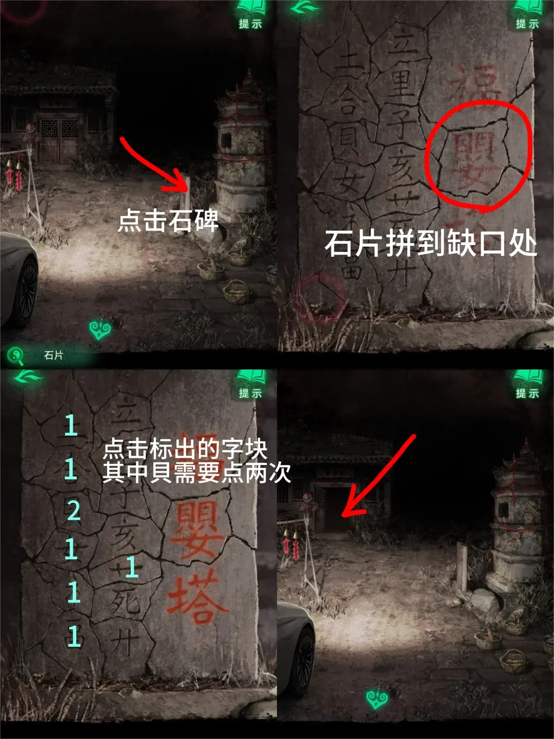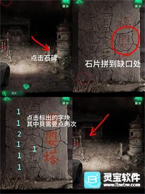 4、回村口将【石片】放回石碑,点左边字碎片依次拼好【福婴塔】三个字打开村口屋子的门