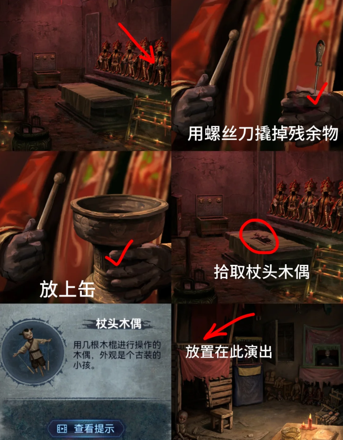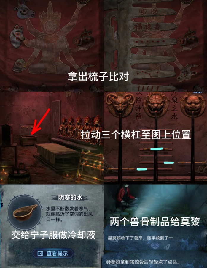 14、回弃煞牢,将【铁枝木偶】放在拿铁棍的木偶师桌上幕布下降将木梳放上去得到牲畜线索【虎4猪6羊7】拖动木屋兽首链条到对应横线获得【阴寒的水】递给宁子服,离开(高能)