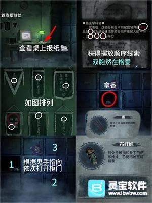 5、【医用钳】撬开右侧办公室门进屋,将两面【锦旗】挂墙上,根据桌上科普标注的字得到锦旗顺序【双胞然在格爱】,找到有对应字的锦旗排序打开停尸柜得到【三炷香】,再根据手指方向依次开柜得到【布娃娃】