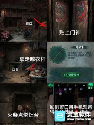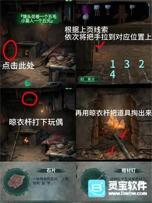 3、回村点右侧房门贴上【门神】开门,进屋拿到【晾衣杆】,【火柴】点燃灶台,用手机照商店窗口得到拉风箱顺序【1321】,【晾衣杆】将灶台上方娃娃打下来(微恐),得到【石片】、【棺材钉】