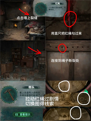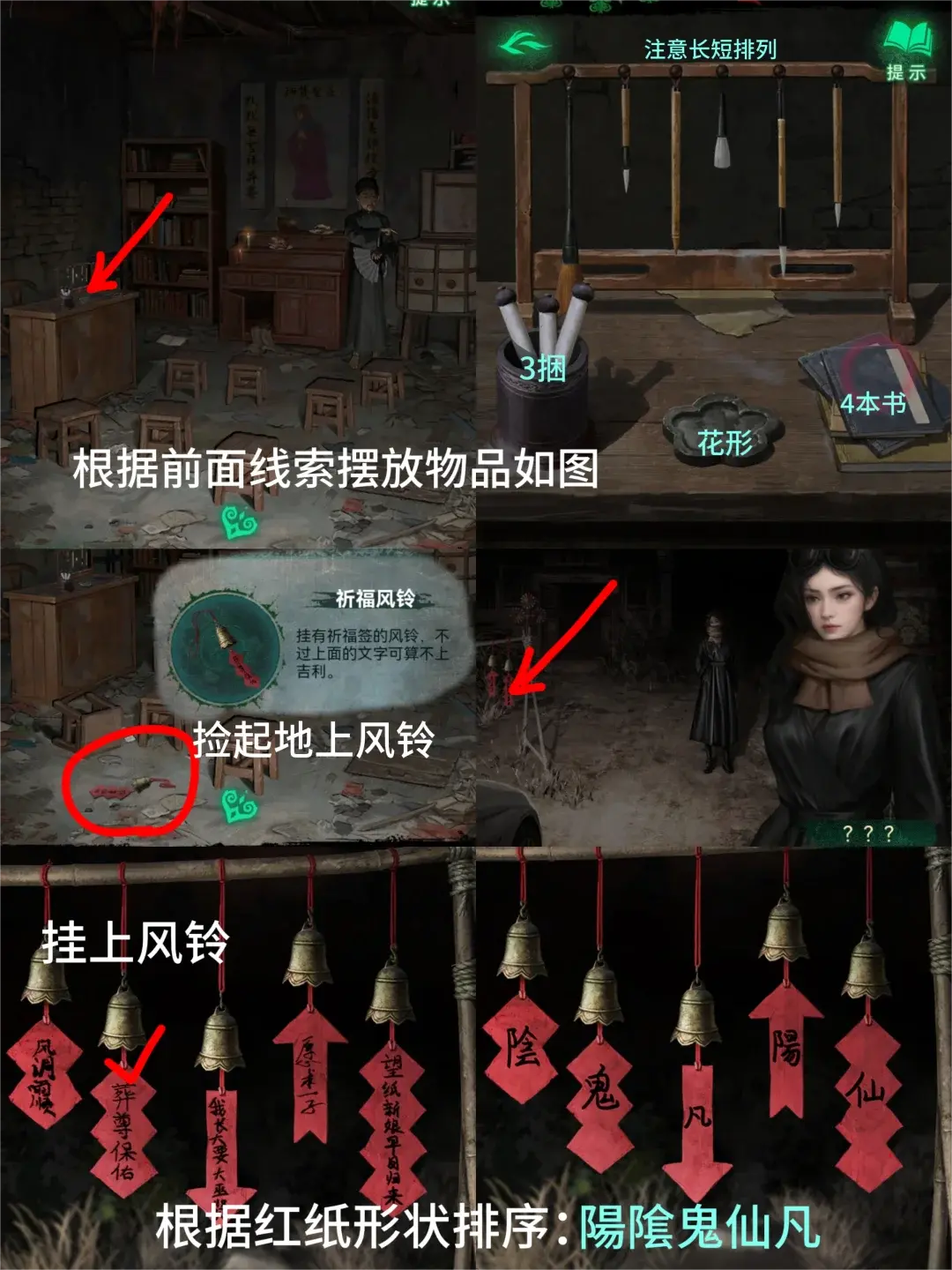 5、拉开右下角地上木门用【手枪】交换得到【直尺】回灶台屋用【直尺】挑出墙缝里的【红绳】再回村口屋子把【红绳】系在断掉的绳子上,点西洋镜得到提示【桃花形砚台、书4卷轴3】点书架,根据书中提示给桌上毛笔排序(微恐)得到【祈福风铃】