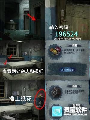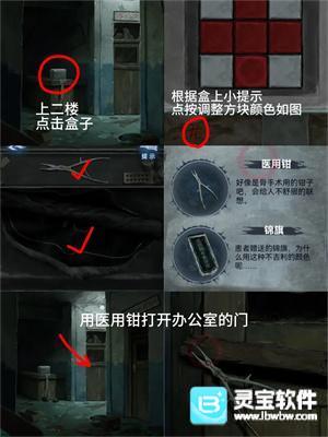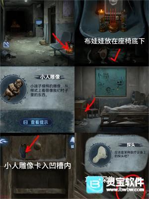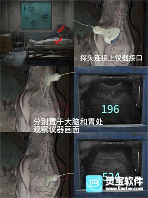 6、回一楼将【布娃娃】放在遗照下方地上得到【小人雕像】,去检查室打开桌子上方抽屉得到【探头】并安在检查床左侧线上,根据二楼病房门提示拖动探头到【脑子和胃】得到密码【196524】打开二楼病房