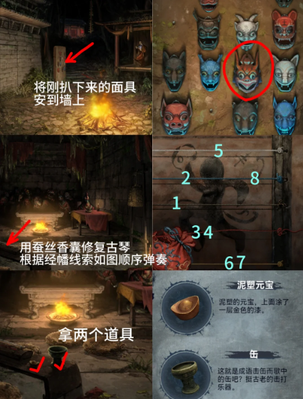 4、进石门,将【蚕丝香囊】里的蚕丝系在左侧古琴上,根据山洞石壁上菜的布条提示弹奏古琴顺序为【黑蓝红红白黄黄蓝】得到【泥塑元宝】【缶】,将【泥塑元宝】放在蛐蛐桌上**(左右两边都行,最后都会变成平)