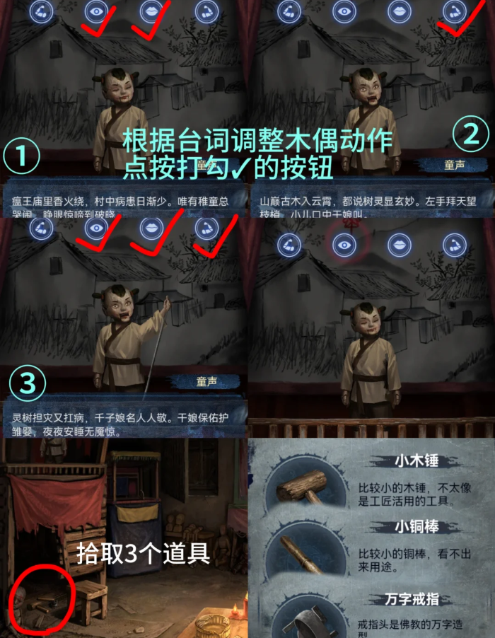 11、回弃煞牢,将【杖头木偶】放在左侧小戏台上根据唱词提示点点击按钮为【眼、嘴、左手、眼、嘴、左手】(最后状态是手都放下,嘴和眼都闭上)得到【小木锤】【小铜棒】【万字戒指】
