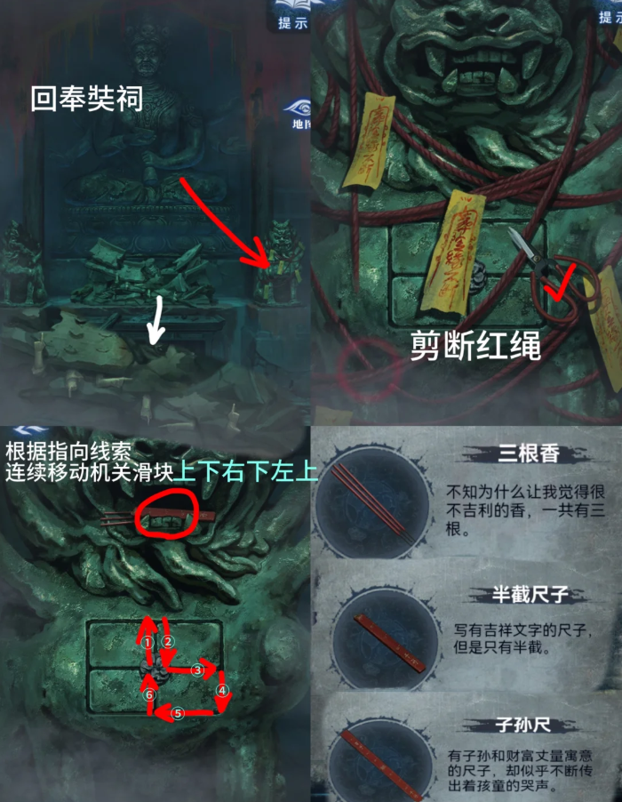 10、进奉奘祠,用【红剪刀】间断石像红绳,根据刚才泥人轿子坍塌的手指方向顺【↑↓→↓←上】移动石块得到【三根香】【半截尺子】,两截尺子拼起来得到【子孙尺】