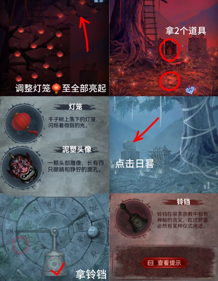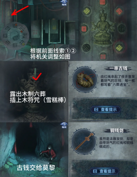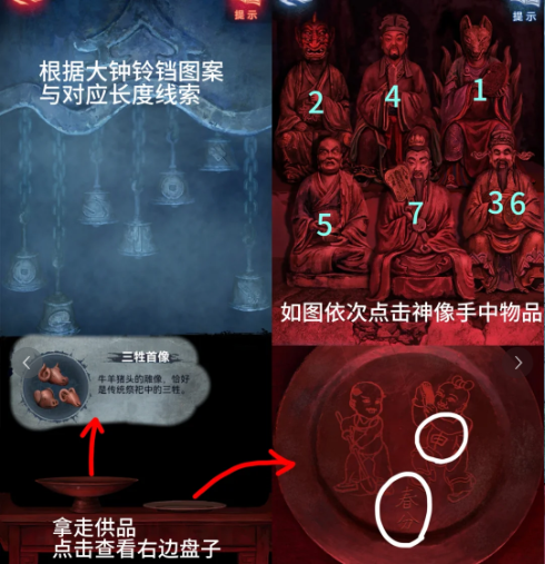 23、点6个神像,将【大铜钱】放在神像上,根据开始的大钟铃铛图案高低依次点击神像【鼓刀钱、官牌木鱼、钱扇】获得【三牲首像】和右侧盘子线索