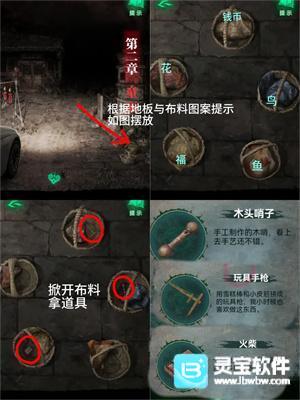 1、点右侧竹筐,对照布和地上图案摆好,点开五个筐获得【玩具手枪】、【木头哨子】、【火柴】