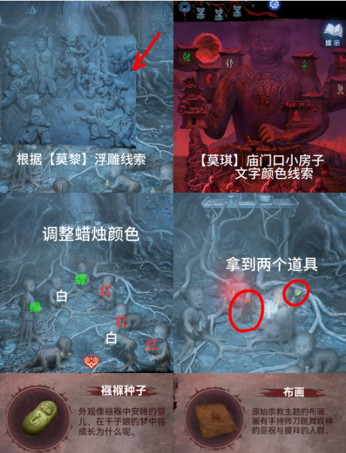 10、进木屋,用【螺丝刀】清理左侧神像手上泥土,将【缶】放上去得到【杖头木偶】,再根据石门内蟋蟀腿线索点亮左下角香炉的香【上排:红黑红黑、下排:红红黑红红】得到【骨头饰品】后递给莫黎