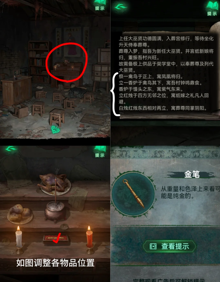 8、回村口屋子根据【账本】提示摆放供桌物品【最上排:空、鸡、空】【第二排:馒头、香炉、空】【最下排:白烛、空、红烛】得到【金笔】