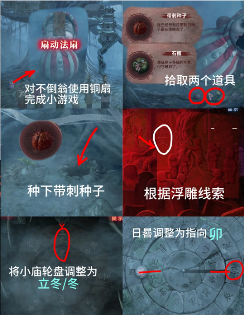 27、在庙旁点击哭泣的不倒翁,用【铜扇】进入小游戏(记方向的,记不住可以跳过)得到【带刺种子】【石榴】