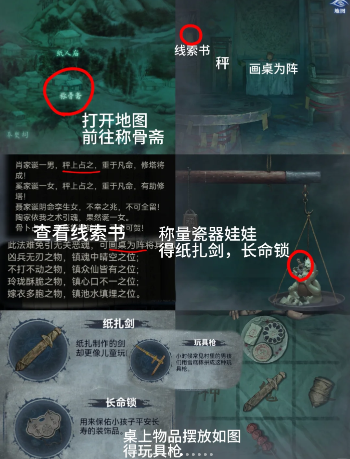 11、地图进称骨斋,将【陶瓷娃娃】放在称骨秤上得到【纸扎剑】【长命锁】,将【纸扎剑】放在右边桌上进入小游戏,根据左侧书架书本提示摆放顺序【天-糕点、鬼-剑、地-糖葫芦、人-陀螺】得到【玩具枪】