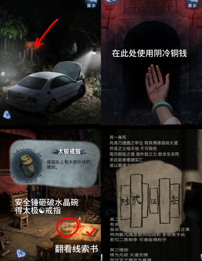 6、将【阴冷铜钱】扔进弃煞牢后进入,用【安全锤】砸开桌上的水晶盒得到【太极戒指】,查看桌上的书得到线索,再回到车旁点树林用手机照得到新线索,两条线索结合【622543】打开墙上机关得到【浆糊和符纸】【小桃木剑】