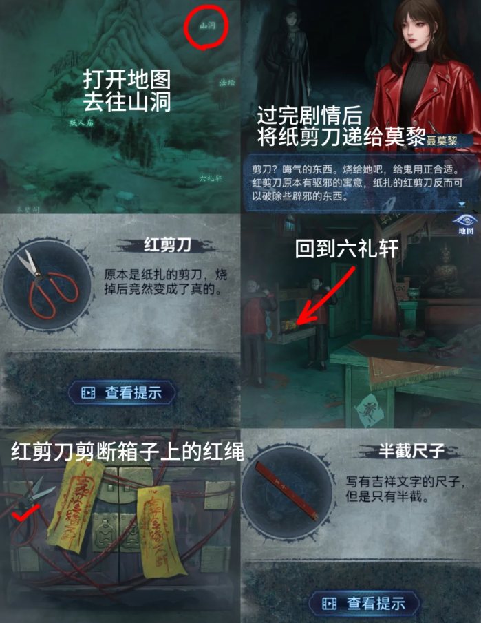 8、地图进山洞触发聂莫黎和明梅,递出【纸扎剪刀】得到【红剪刀】,【朱砂】递给莫黎(这里我是第10步完成后回来给的,可以尝试先给)