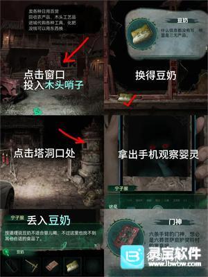 2、手机照旁边塔里看到一个吸手指的婴儿(微恐),进村到商店把【木头哨子】扔进去得到【豆奶】,回村口把【豆奶】扔进塔里得到【门神】