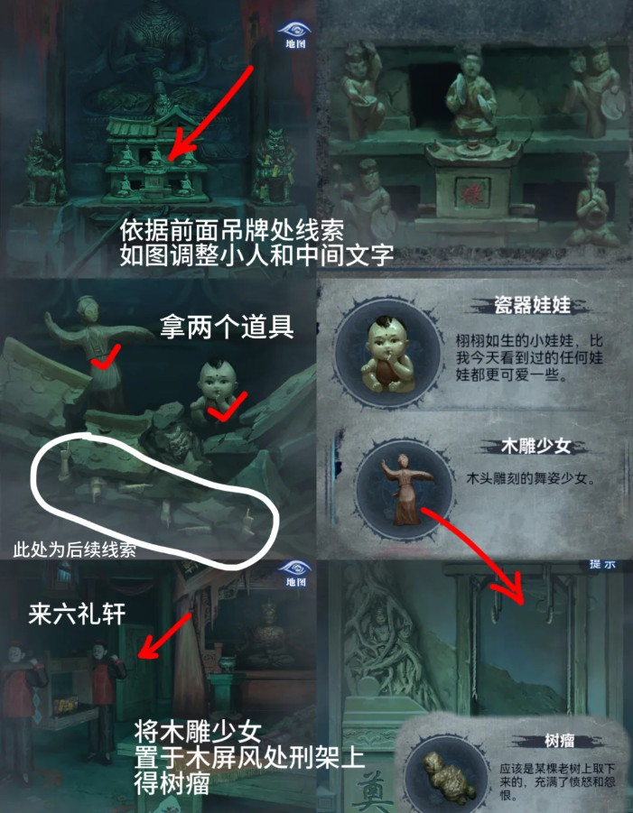 6、进祠堂根据纸人庙窗外许愿牌提示排列泥人和轿子【鼓、镲、锣、锣、禄、唢呐】得到【木雕少女】【瓷器娃娃】