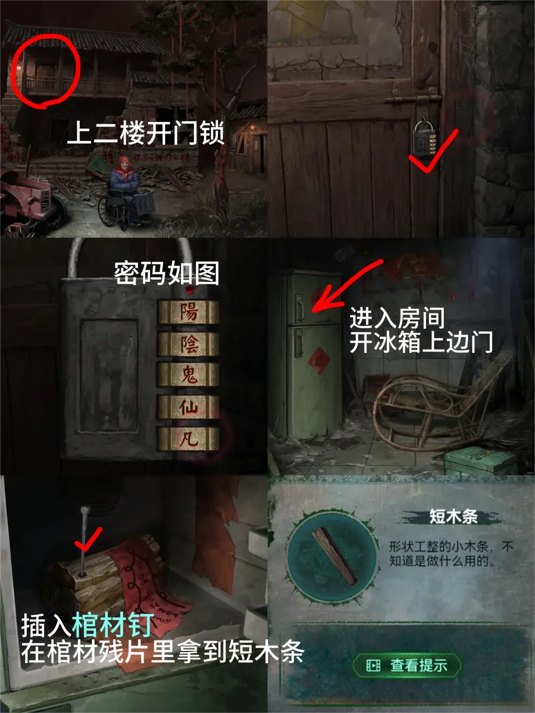 7、进屋点开冰箱将【棺材钉】**棺材小孔得到【短木条】,手机照屋内得到小孩颜色提示,点摇椅旁盒子从上到下顺序为【黑蓝白红】得到【账本】、【朱砂】