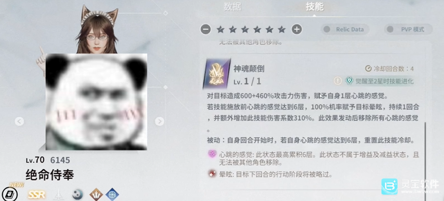 若技能施放前心跳的感觉达到6层,异额外增加此技能伤害系数360%,此效果发动后移除所有心跳的感觉移除自身所有减益状态,100%机率赋予目标晕眩,持续1回合且额外对其相邻角色造成360%攻击力伤害。