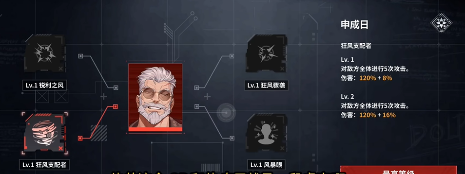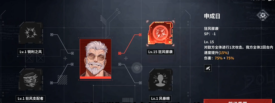 主动技倍率起点75%,与吕泰洲、成艺彬一致,并附带两回合全体速度提升15%。游戏一回合只能跑一轮,超出敌方的速度后,速度基本为无效属性,在我方速度低于敌人时,有一定效果,这里的速度加成主要效果还是作为专属光引导效果的触发器。