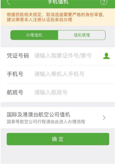 4、输入值机信息。凭证号码可以是购买机票的证件号码,也可以是机票的编码。手机号要写购票时填写的乘机人的手机号码。航班号,要写机票对应的航班号。