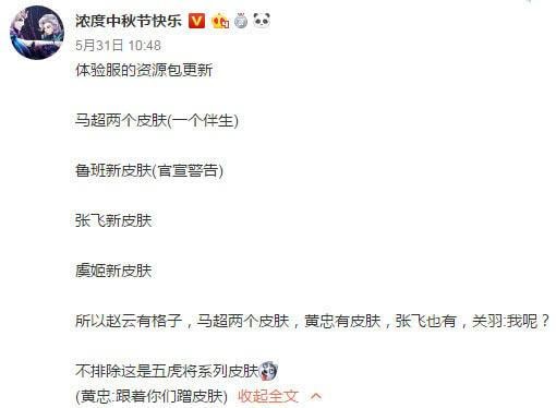 从上图来看这一次出五虎将系列皮肤的可能性非常大,并且极有可能是伴随着新英雄马超上线之后正式推出五虎将皮肤的,毕竟在国内喜爱三国这个系列的玩家非常之多,每一次三国英雄上线都可以让天美赚的盆满钵满,至于五虎将的皮肤上线时间预计是与马超这位新英雄上线的时间差不多的6月28日,不过在皮肤与英雄还未上线的时候妄下定论,也总是会被打脸,所以各位小伙伴还请以官方正式的版本更新为准。