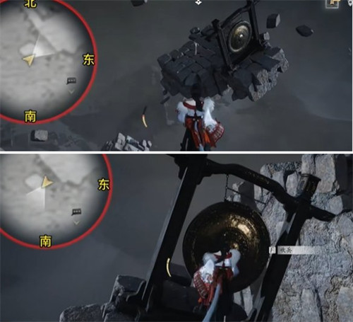8、上到最高点可以看到铜锣,跳过去敲一下。