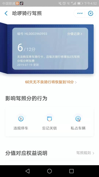 上图之中其实也给出了答案,那就是60天无不良骑行将可以恢复到10分。