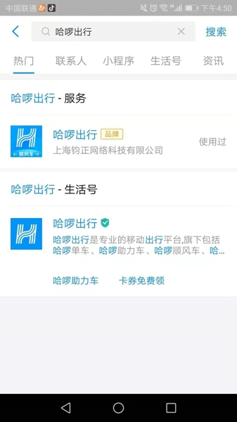 1、第一步首先打开你的支付宝,搜索哈罗出行,进入哈罗的界面。