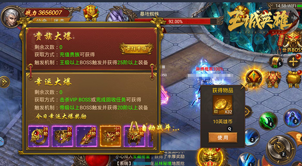 幸运大爆技巧:在拥有幸运大爆次数时,击杀星级或主宰级BOSS,更有机会掉落高阶金装。