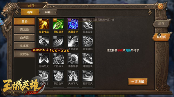 技巧思路:在打公会秘境和王城地宫时,建议不使用主动技能绝学,全部换被动绝学与触发性绝学。个人绝学搭配如下:
