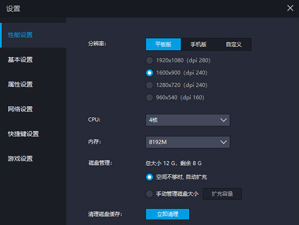 2、在性能设置分辨率和CPU与内存全部加满,让你的模拟器画面更好,当然这个根据玩家电脑的配置来。