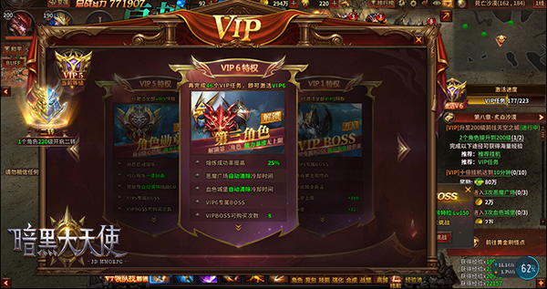 脱离低级游戏趣味,享受绿色游戏模式。37《暗黑大天使》“免费升级VIP”玩法,让你秒变土豪。玩家无需充值就可升级VIP特权,享受多项特权加成。只要玩家在游戏中完成对应任务,即可解锁VIP等级,创建第二、三角色、装备自动熔炼、经验加成、免费传送、更多副本次数、每周福利礼包、远程商店等功能。