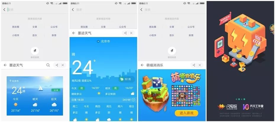 搜狗小程序在这个中心化展示入口里,里面有王者汉字、*分类、起名神器、微店助手、墨迹天气等等诸多小程序,甚至还有游戏。搜狗小程序基于用户端的作用是让用户摒弃搜索引擎在你通过浏览器搜索相关内容的时候直接通过输入法就可以将内容结果呈现给你,而不再需要搜索引擎,想一想当你通过搜索引擎输入“墨迹天气”的时候直接进入墨迹天气搜狗小程序,那么搜索引擎就不再需要了。无论用户在百度还是微信里搜索还是搜索引擎搜索务,都需要先输入服务关键词,输入这个动作是触达服务的前提,如若用户在输入的过程中,就能在搜狗输入法内找到服务,就可能不会去百度搜索页去使用服务了。