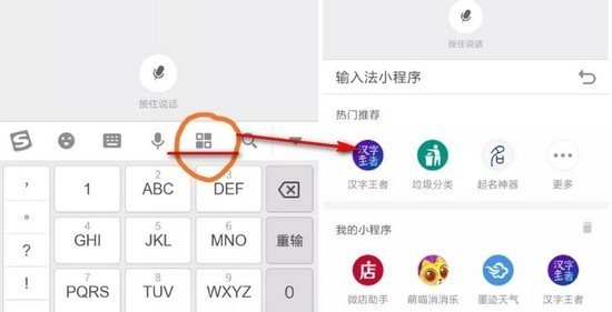 那么问题来了搜狗小程序的入口在哪儿?搜狗输入法小程序要怎么进去呢?很简单,但是也很隐蔽,在安装搜狗输入法之后无论是IOS还是安卓用户,在输入界面切换到搜狗输入法,然后如图所示在输入框下方的搜狗输入法里,有一个专门的小程序入口。