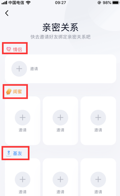 进入后,就可以选择邀请好友来绑定关系,可以绑定情侣、闺蜜和基友关系。