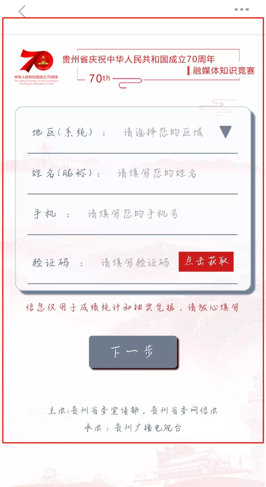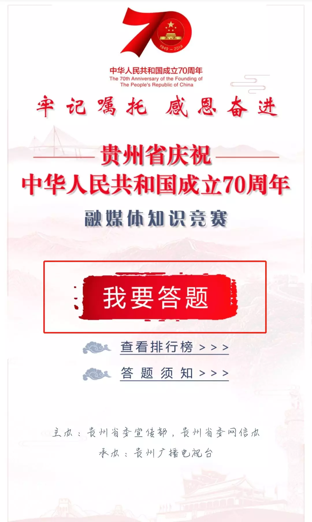 贵州省庆祝**成立70周年融媒体知识竞赛活动时间:2019 年9 月10日至9月24日16时。