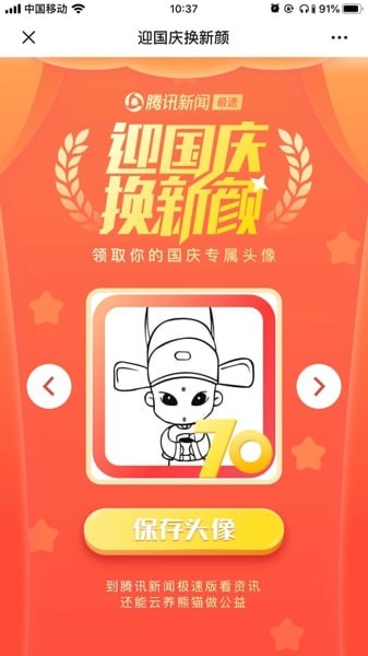 “请给我一面红旗@微信官方”就是个谎言,嘻嘻嘻!你可以通过这个来自腾讯新闻极速版通过微信的一个H5页面,制作一个带有70周年国庆庆典头像,然后发一条这样的说说哈。
