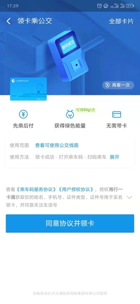 2、点击电子公交卡进入领取界面,在这里点击同意协议并领卡,指纹验证就可以领取了;