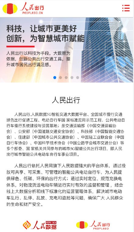人民出行依托人民网旗下人民数据强大的平台体系,通过投放可共享、可采集、可管理的智能公共电动自行车,为人民提 供绿色、低碳、环保的出行方式;通过实时定位、规范充换电体系,对物流货运电动车辆进行实时有效的监督和管理 ,结合线上大数据分析和线下标准化的运营管理体系,解决城市电动车乱行、乱停、乱放、充电和盗抢等问题,确保广大 人民群众的生命和财产安全。