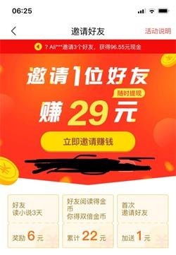 在邀请新的好友下载红果小说,并且填写邀请码绑定,好友在红果小说里面阅读小说三天可以获得6元现金奖励,好友阅读小说你的获得金币双倍,首次邀请好友还加送1元,好友每天最持续阅读小数累计可在获得22元。邀请的好友数量无限,邀请越多奖励越多。