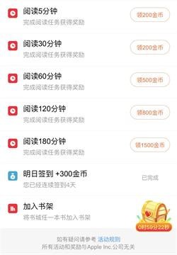 用户阅读小说5分钟、30分钟、60分钟、120分钟、180分钟会获得的3200的金币,加上每1小时可以才开一次保险的,每次保险获得333~666金币不等,总共上3小时最少获得4200金币。