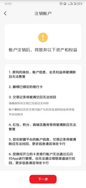 5、在注销账户界面会有一些提示注销之后失去的权益,选择下一步就可以实现注销了。