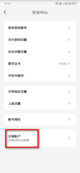 4、在安全中心的最下方就可以找到注销账户的选项;