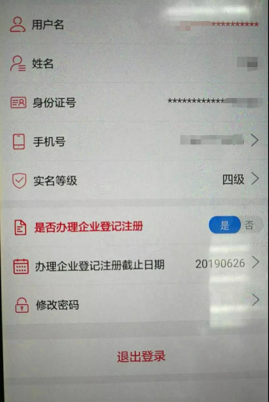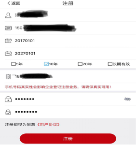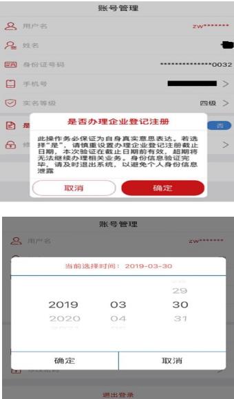 注意:只有四级实名的用户才可以参与企业登记注册功能。是否办理企业登记注册选择“是”,选择企业登记注册截止日期。