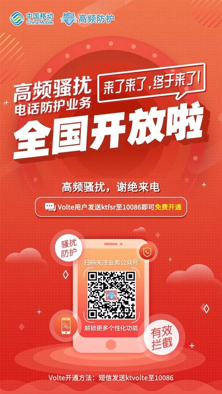 只要是volte用户可以发送ktfsr至10086即可免费开通。需要注意的是,开通中国移动高频骚扰电话防护业务前需要确认是否开通移动VoLTE功能。(VoLTE开通方式:发送短信ktvolte至10086即可)。