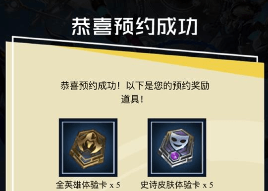 参与预约的召唤师,将获得全英雄体验卡x5、史诗皮肤体验卡x5、3胜双倍经验卡x2、3胜双倍精粹卡x2。