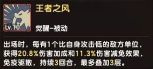 觉醒技能【王者之风】完全展现了百兽之王的风采,每遇一个攻击力低于我们的敌方单位,就能获得一定比例的伤害和伤害减免,这个效果免疫驱散,最多能够叠加三次,【王者之风】最强大的地方在于它是个被动技能,不需要释放,出场就能加持的天然BUFF,如果敌方单位当中存在超过3个低于我们攻击力的宠物,BUFF直接拉满,还无法驱散,简直无情。