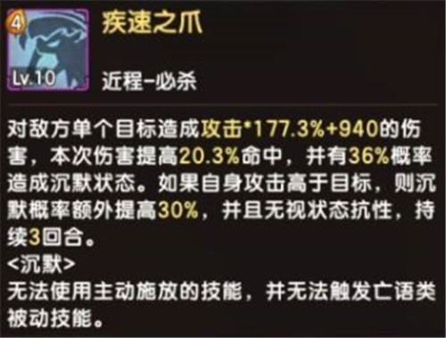 必杀技【疾速之爪】是非常强悍的单体点杀技能,也是老虎系的看家本领,不仅能够对敌方单体造成成吨伤害,在攻击的同时还有几率沉默目标,如果攻击力压制了对方,沉默概率将大大提升并且无视所有状态抗性。在释放【疾速之爪】时根据不同属性可以提升不同效果,地属性能够增加防御,火属性能够提升暴击概率,风属性增加命中,水属性回复生命。