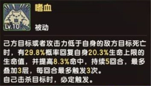 被动技能【嗜血】在己方目标或是攻击力低于自身的敌方目标死亡时能够获得血量回复以及特殊属性提升,水属性提升伤害减免,地属性获得防御增加,火属性提升攻击,风属性提升命中。这个技能如果在攻击力高于对方的场合可以发挥出超级强力的效果,全场所有人都是你的免费”加油站“。