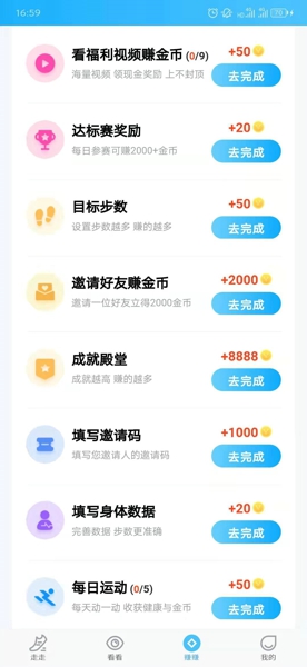 3、在赚赚的界面,有着很多日常的赚金币任务,比如说达标赛奖励、目标步数、邀请好友赚金币、成就殿堂、填写邀请码等等各种不同的金币任务,只要完成就会有着相应的奖励。