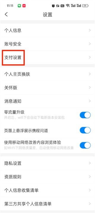 3、接着来到设置的页面中可以使用个人信息、账号安全、支付设计者、个人主页换肤等功能,点击其中的【支付设置】;